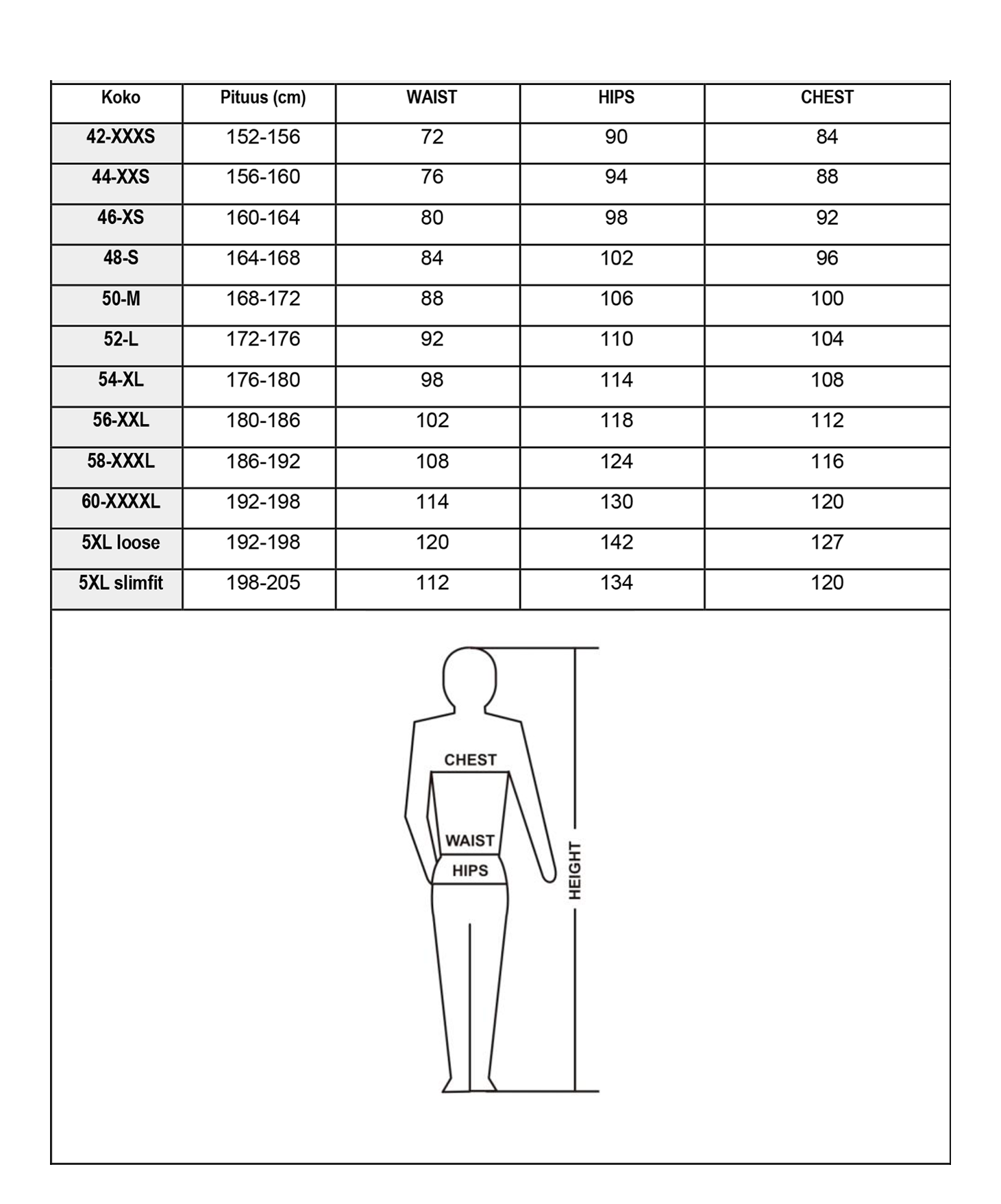 Koot meillä on laajasti 3XS – 5XL, 152 – 205 cm pituisille. Sovitushaalariseteistämme löytyy jokaista kokoa.